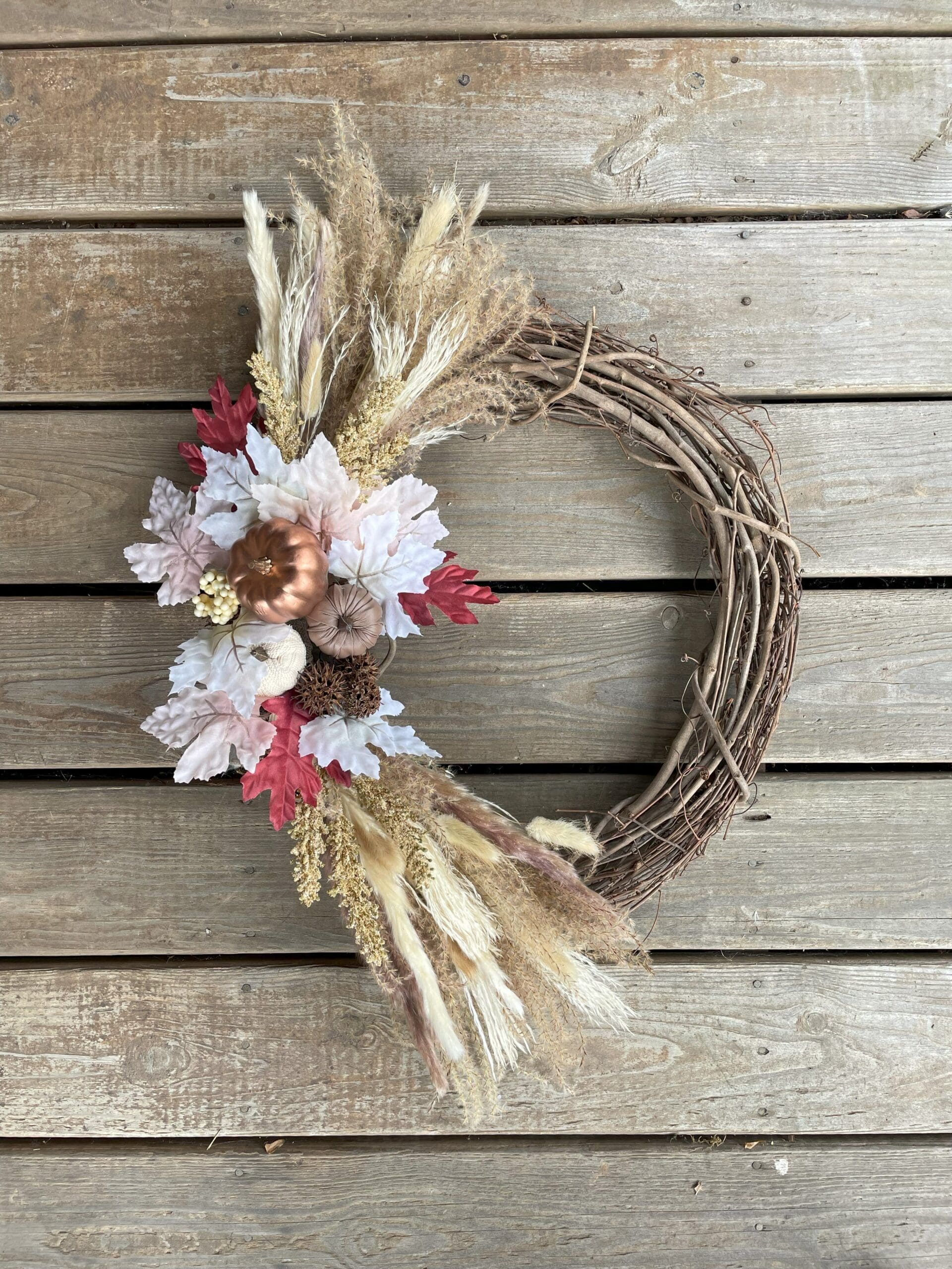 - Attach Fall Foliage: Attach your faux fall foliage mixed in with the natural grasses. Distribute the fall foliage around the wreath, mixing up the colors and shapes for a more eclectic look.