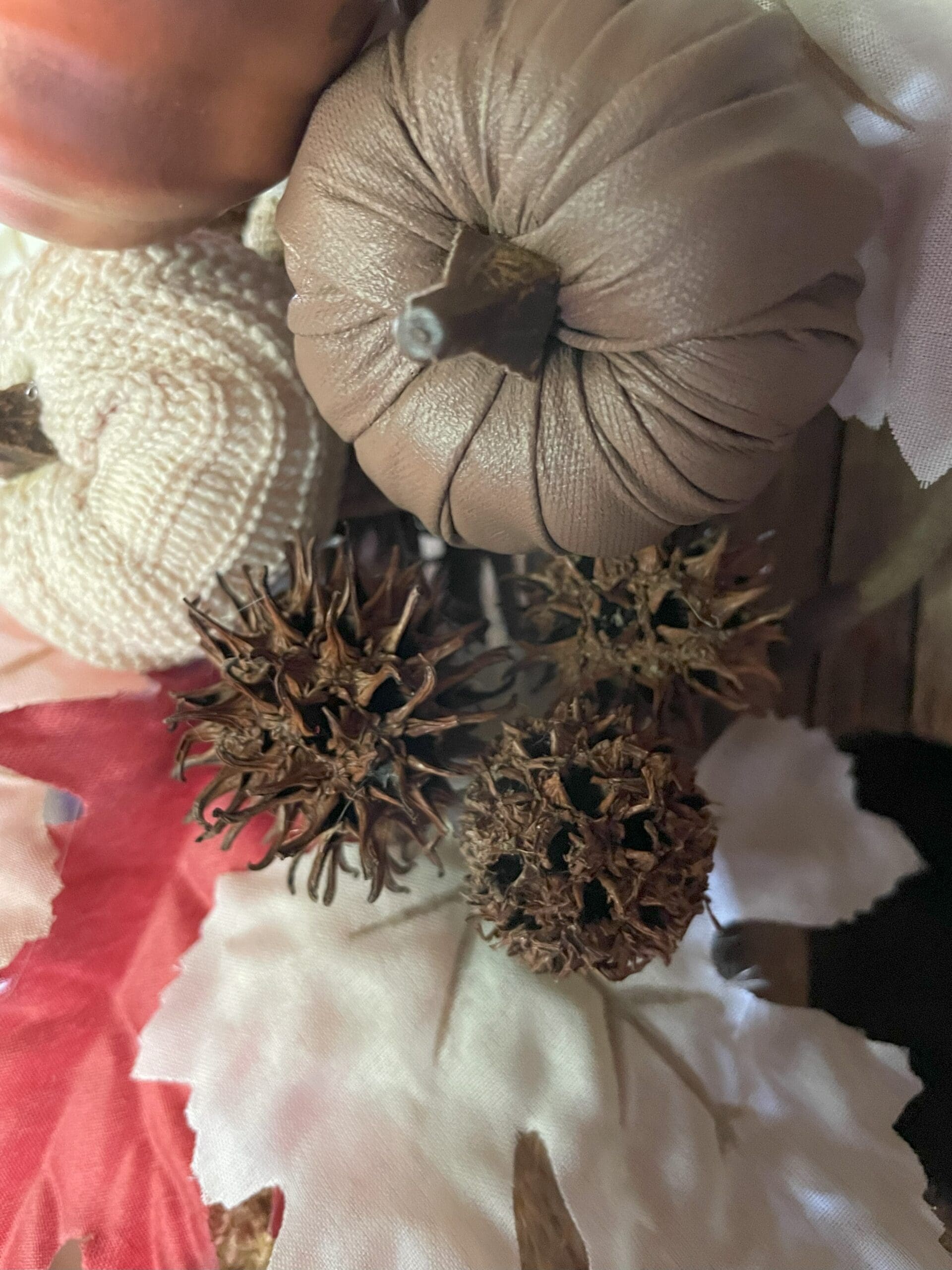 - Faux Fall Foliage: Choose an assortment of artificial autumn leaves, berries, or flowers. Opt for warm, earthy tones. I used the cream-colored fall leaf pics from Dollar Tree.