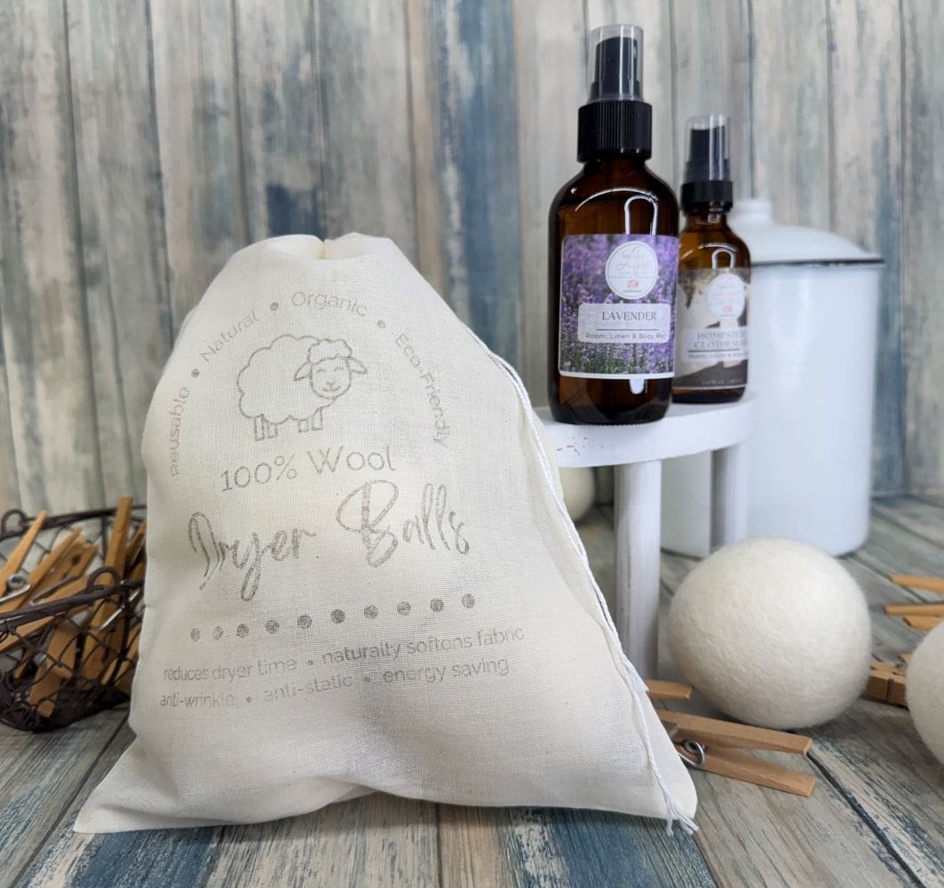 Each set includes three wool dryer balls, packaged in a hand-stamped muslin drawstring bag for easy storage. The bag is stamped with the benefits of wool dryer balls and a touch of inspiration to brighten your laundry routine!