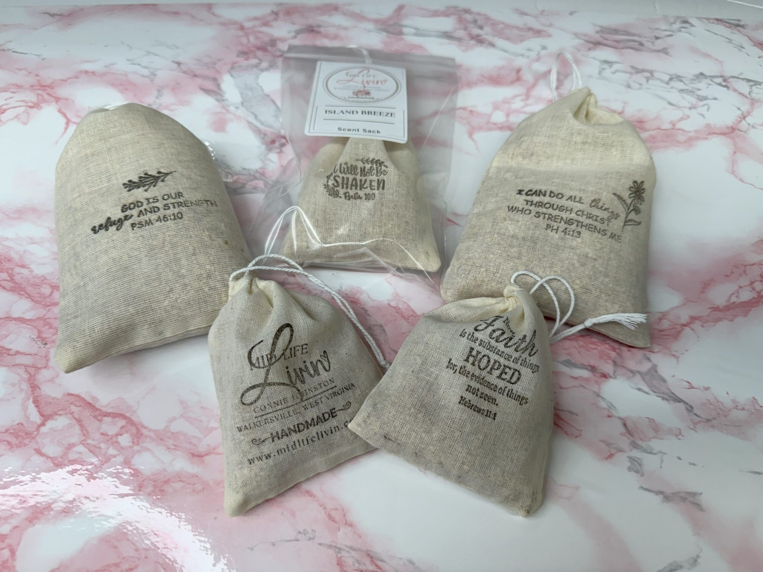 Experience the fresh scent of our Island Breeze Scent Sack.  Each sachet is thoughtfully packaged in a drawstring muslin bag, beautifully stamped with Bible verses and inspirational messages.